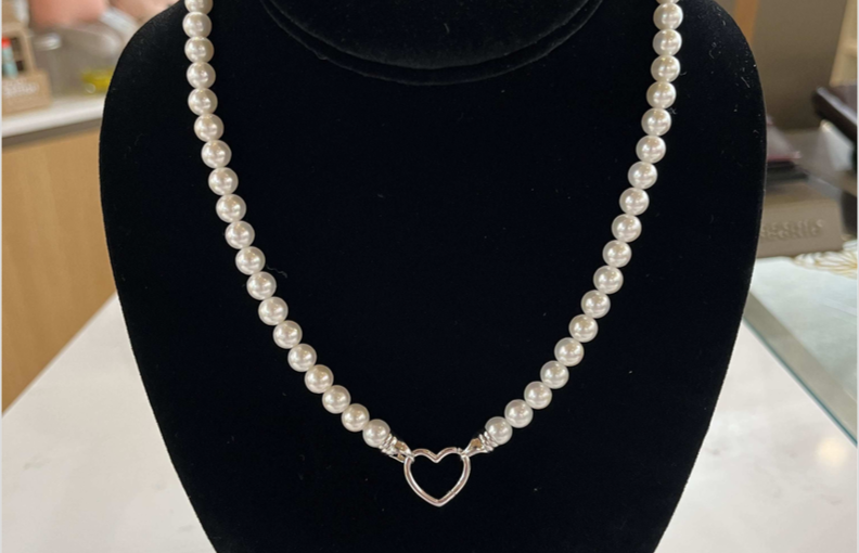 A stunning freshwater pearl and sterling silver heart necklace from Stories-By-Swissbo, or one of their gold-plated, stainless steel necklaces for something a little more contemporary.
