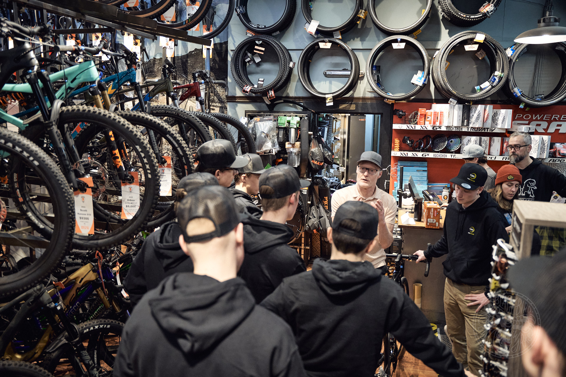 It’s easy to see that James and his business are passionate about more than just mountain biking; they’re deeply invested in the neighbourhood community as well. With a buyback program for kids’ bikes that helps parents keep up with their little riders’ growing bike needs at a more affordable price, and their involvement with Bikes For Tykes, which collects, services, and distributes donated bikes to children who wouldn’t have access to them otherwise, Obsession: Bikes is doing their part to make The Shipyards District an especially awesome place to be. “I pinch myself all the time for living here,” says James, “the forest and the quiet, but also the city vibe– the corner of 1st and Lonsdale any night of the week is just so vibrant.” He calls out some local restaurant favourites like Joey Shipyards, Burgoo Bistro, Meat at O’Neills for lunch (Shari and Martin!), or feeding the crew at JamJar Canteen for healthy and filling Lebanese. “We’re cyclists, so we love to eat! The Eggs Benny at Lift Bakery, or the cookies at Mo’s General Store– that’s the secret.”