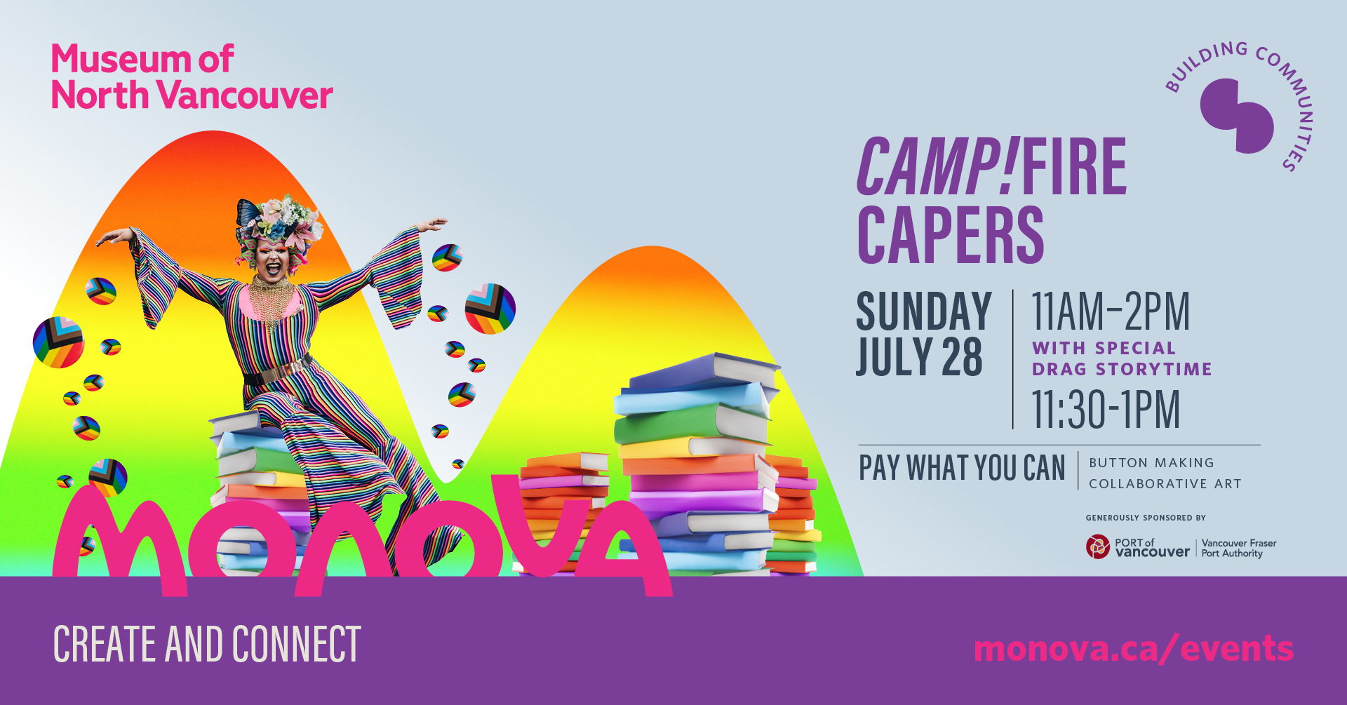 Join MONOVA for a celebration of Pride. CAMP!fire Capers is an all-ages show, with stories inspired by the North Shore and family-friendly drag numbers. Express yourself through button making, create collaborative art, and experience the joy of drag storytime!