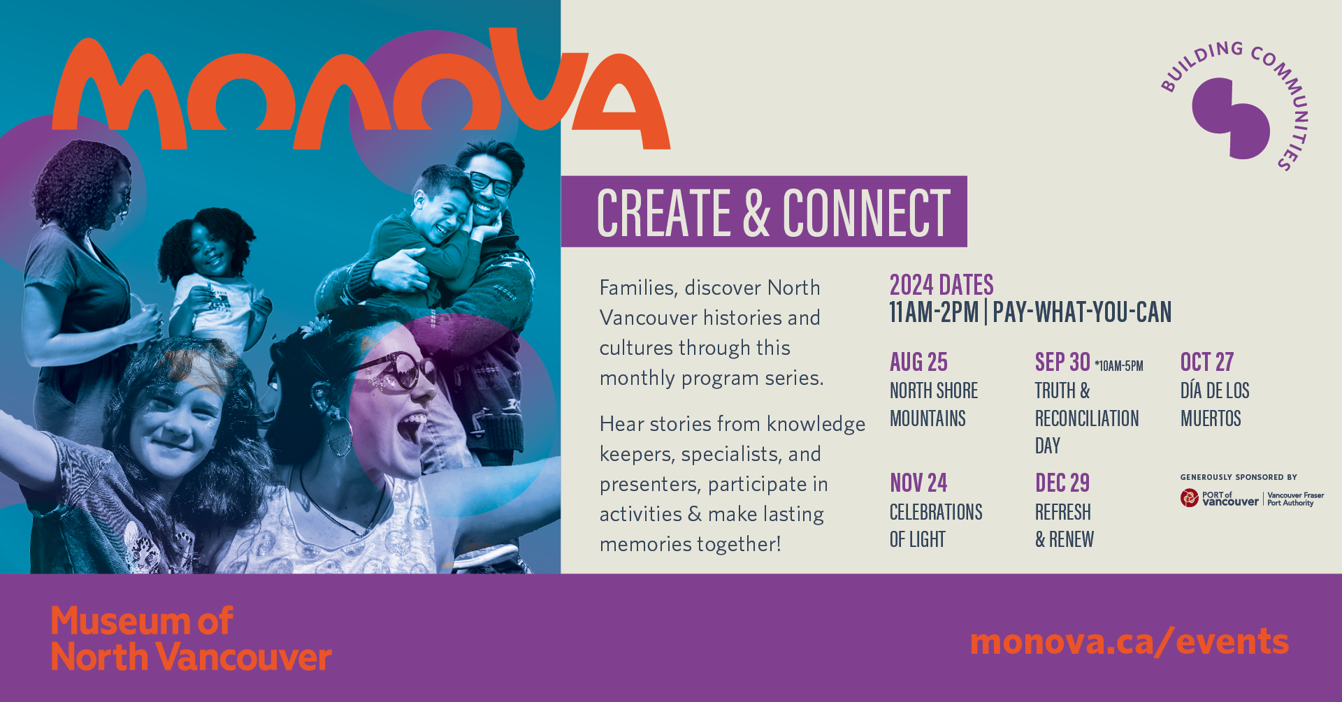 Families, discover North Vancouver’s histories and cultures through this monthly program series. Hear stories from knowledge keepers, specialists, and presenters, participate in activities & make lasting memories together! Drop by for a scavenger hunt of our new exhibit, Found in the Mountains. Learn how to co-exist with local animals in our forests with the North Shore Black Bear Society, and enjoy MONOVA presentations, Making Mountains, Tree Talks, and Amazing Animals. Sunday, August 25, 2024 Audience: All Ages Time: 11:00 am – 2:00 pm Pay-what-you-can Generously sponsored by the Port of Vancouver.