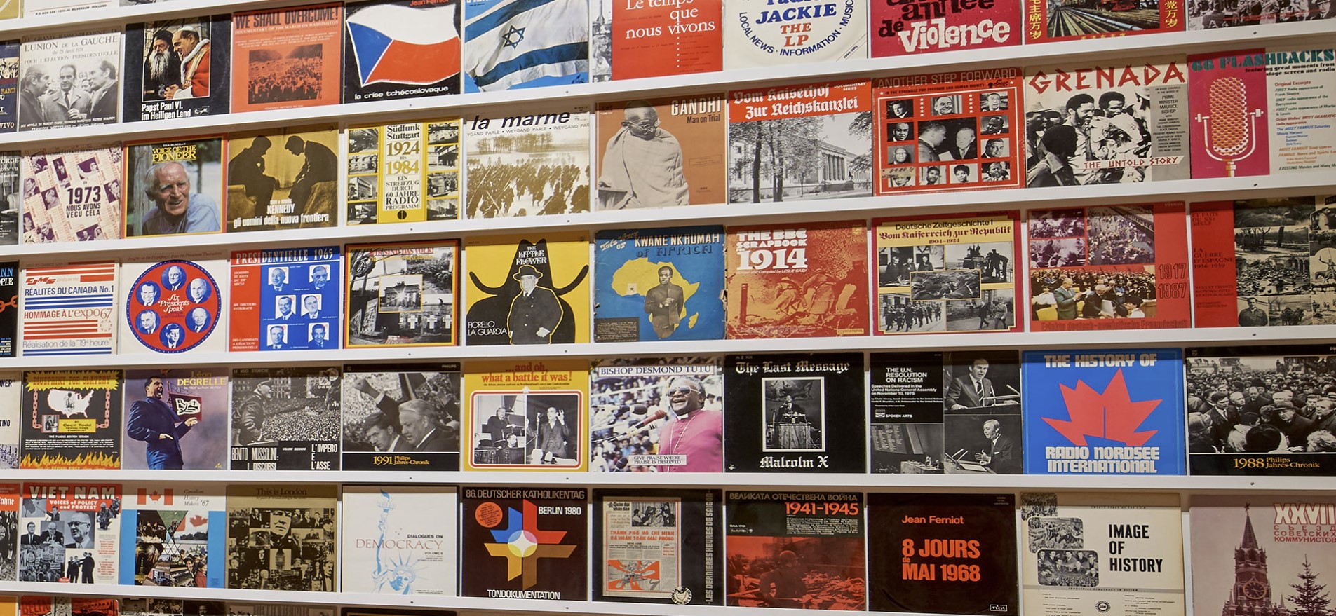 Installed in a dense grid on a wall, the array of LP covers can be understood visually as an alternative ‘history painting’; albeit one that refuses to serve a dominant narrative. Bracketed in time by the invention of the phonograph (1877) and the Fall of the Berlin Wall (1989), Gal’s rich collection of sound recordings, chronicles “speeches and interviews of those who were in power, others who objected to this power, of war and peace agreements, human rights struggles, and other radio broadcasts of the events that shaped history.” Focusing on Gal’s engagement with sound as subject and material, the exhibition includes a listening station with access to his recent works for radio, the full sonic archive of Historical Records, as well as the artist’s eponymous book (published with Snoeck in 2018), a sumptuous compilation of his in-depth research into an almost disappeared phenomenon of sound documents – also available at The Diane Evans Bookstore.