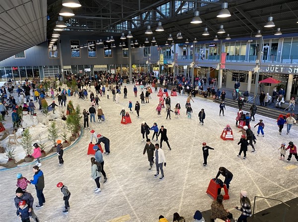 Public Skate occurs daily from 1pm-8pm. Rink access is free if you bring your own skates, skate rentals are available at The Supply Shop: $5 for kids skates and $7 for adult skates.