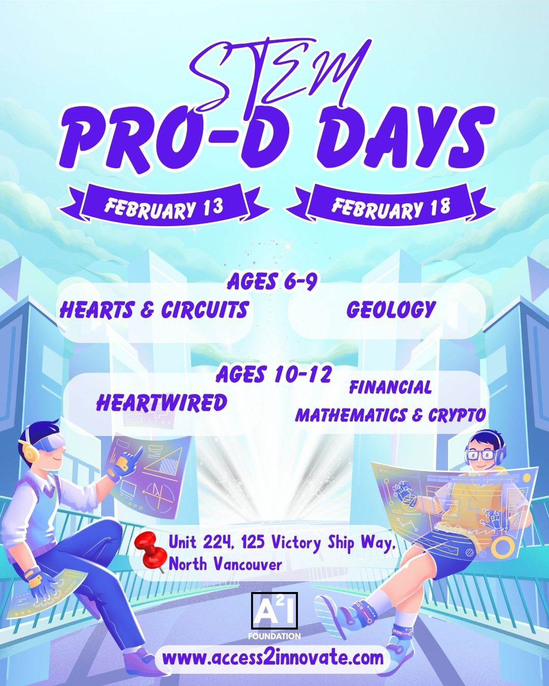 Hands-on STEM experiences where kids explore coding with kindness, creative technology, geology discoveries, and real-world money skills. From heart-centered tech projects to rocks, budgeting, and digital currencies, each Pro-D Day is designed to spark curiosity, creativity, and confidence — all while having fun!