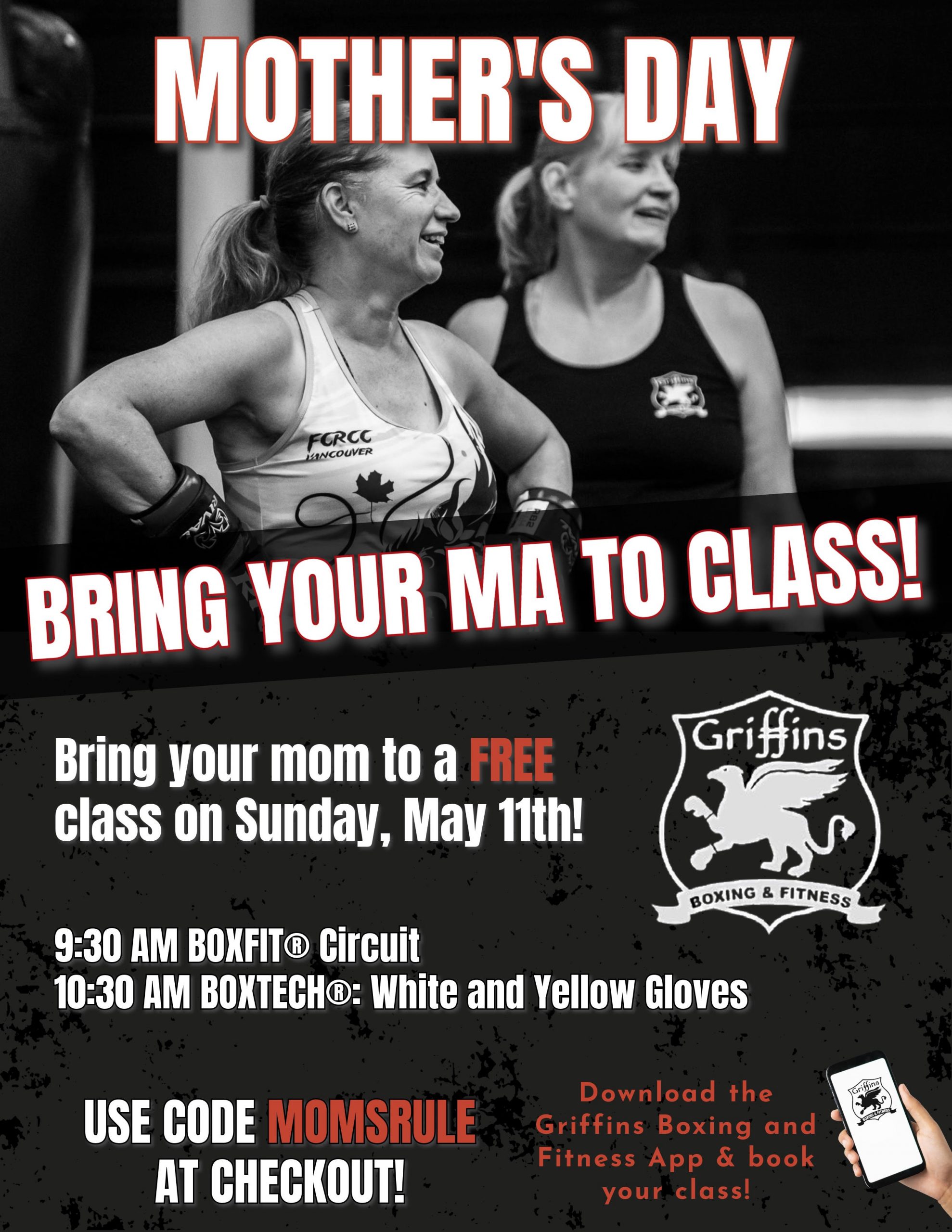 This Sunday, May 11th, Griffin’s Boxing & Fitness is celebrating Mother’s Day with a special Bring Your Ma to Class event—moms can join a FREE boxing class alongside their kids!
