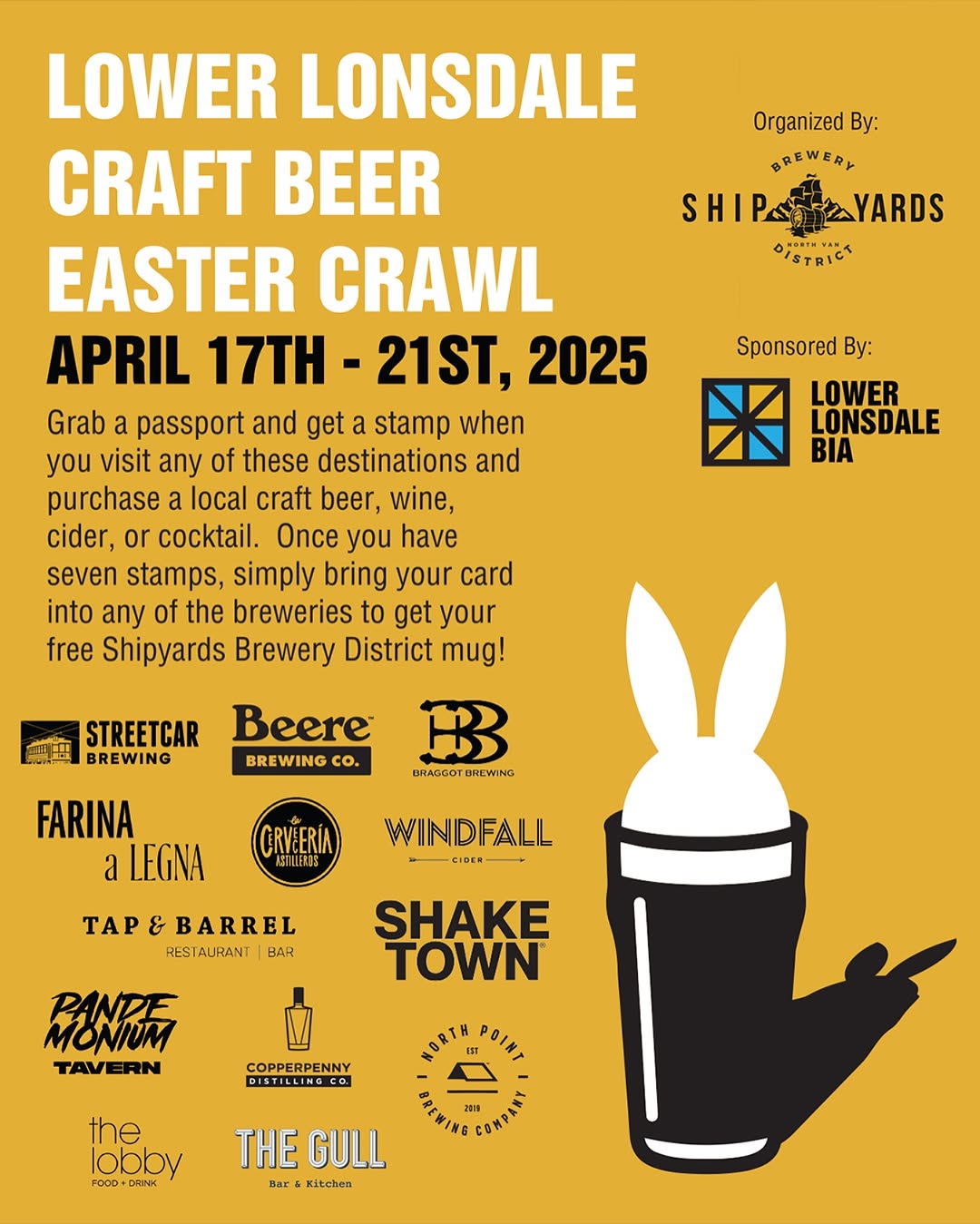 The Easter Crawl is back again this year! April 17th – 21st visit any of the participating destinations and purchase a local craft beer, wine, cider or cocktail and get a stamp. Collect 7 stamps and turn your card in for a brewery district-branded mug.