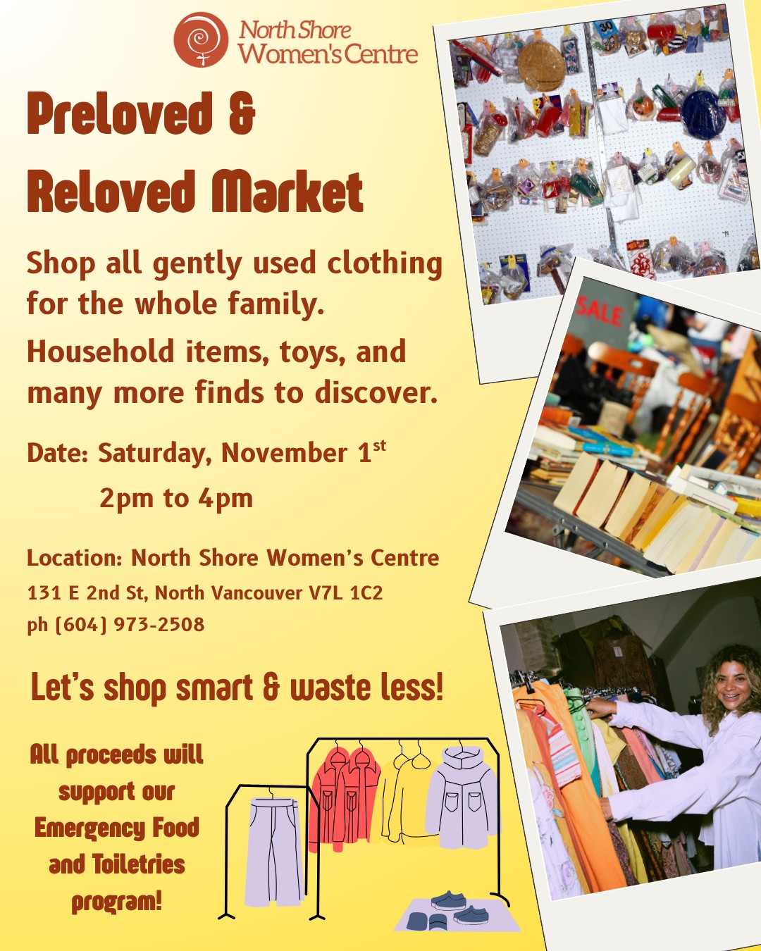 Are you looking for some affordable clothing for yourself or your children and want to support sustainable fashion? Come join us at the North Shore Women’s Centre, 131 East 2nd St., North Vancouver, on Saturday, November 1st from 2-4pm for a Preloved & Reloved Market event! Thanks to our volunteer organizers, ❤️ all proceeds will go to support our Emergency Food and Toiletries program. Hoping to see you then!👗👕🧥👟