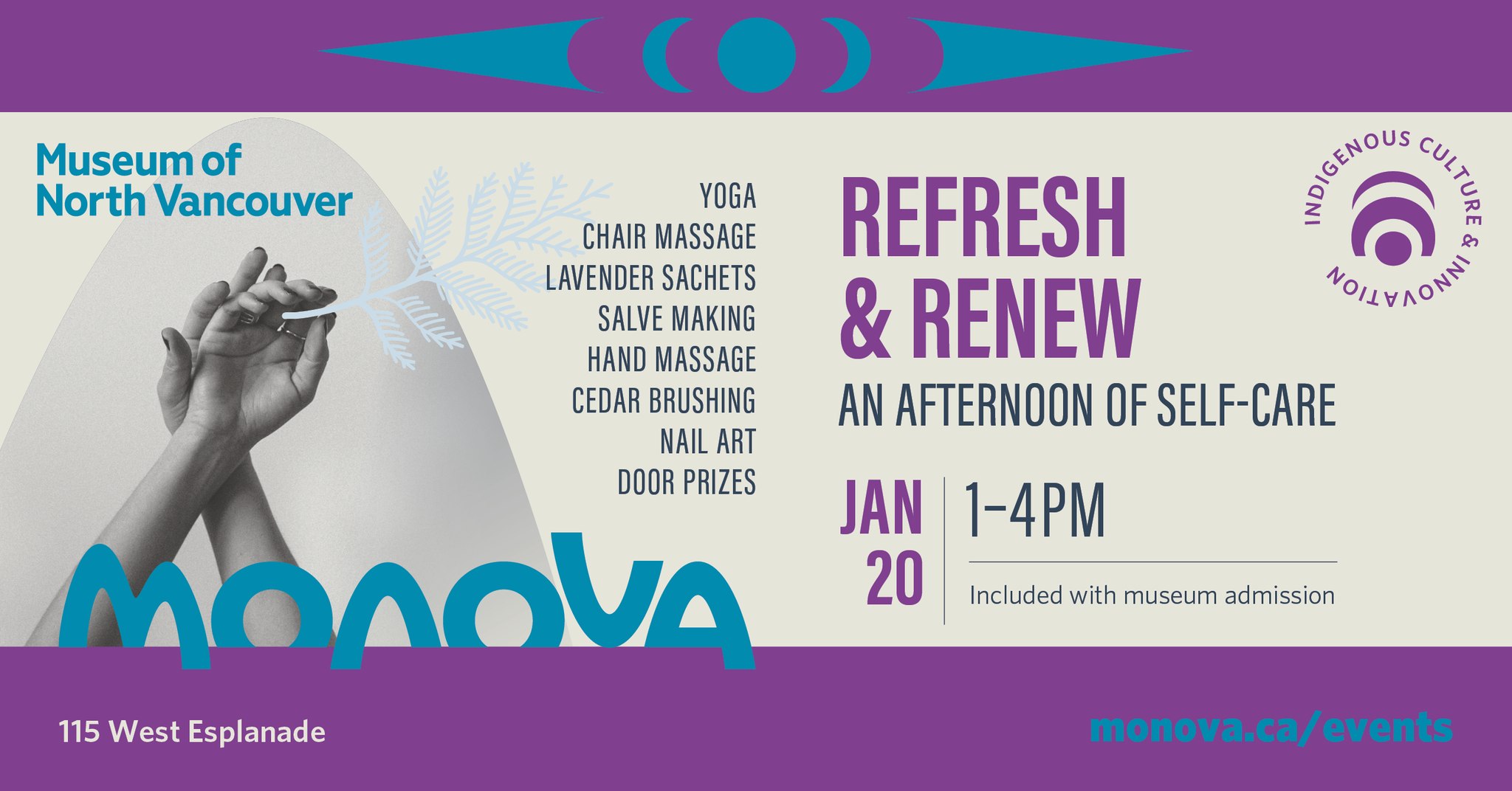 Offering an afternoon of self-care for your mind, body and spirit led by Tsawaysia Spukwus, Indigenous Cultural Programmer at MONOVA.