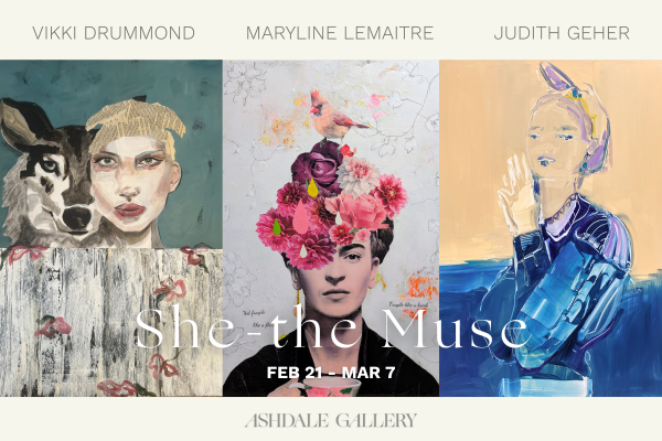 She – the Muse brings together three artists whose work dissolves the old divide between the artist and her subject. Vikki Drummond’s surreal symbolic figures, Maryline Lemaitre’s layered dreamer figures, and Judith Geher’s iconic and muse-like portraiture all speak to an inner dialogue where the feminine is both the observer and the observed, the dreamer and the dream. Together, their paintings trace a visual journey of self-invention – from bold strokes of colour and texture to whispered layers of emotion – offering a world where the muse no longer waits to be seen; she sees herself.