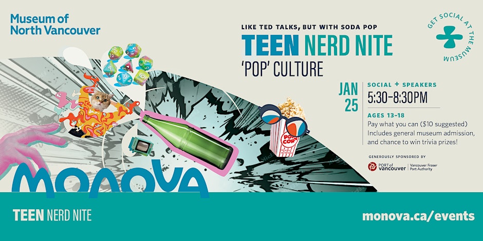 After overwhelming demand from nerds under the age of 19, the first-ever Teen Nerd Nite was launched in 2020 in partnership with student volunteers from Carson Graham Secondary. Join us at the Museum of North Vancouver as we re-launch Teen Nerd Nite, led by a team of MONOVA volunteers ages 13-18.