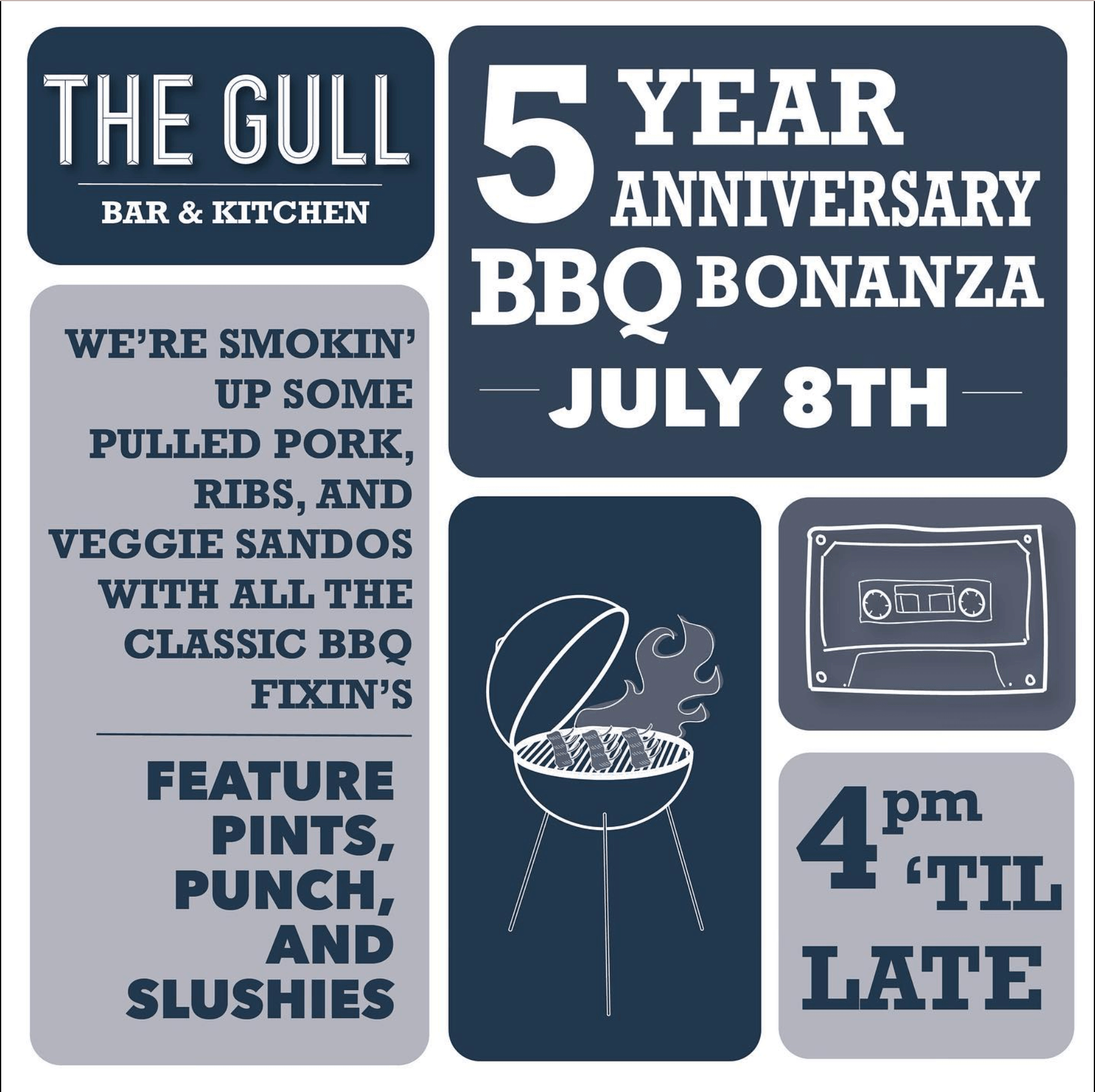 We’re opening our doors at 4 pm for BBQ, feature drinks and party games. Come and go as you please, no reservations necessary!