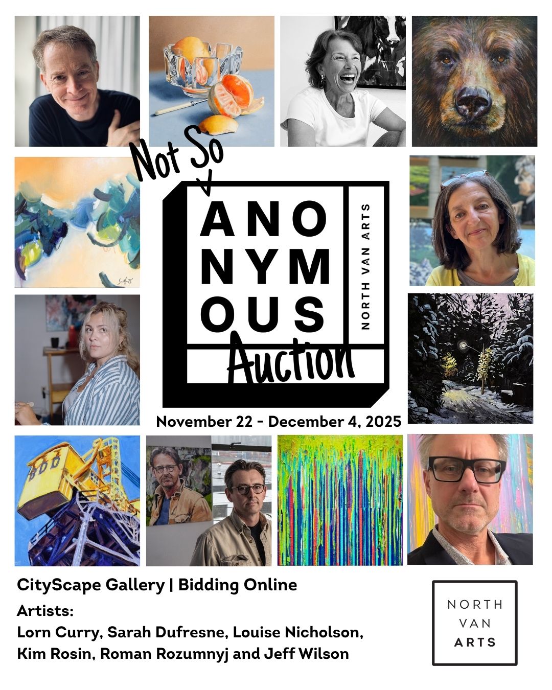 This year North Van Arts invited six of the best-known and sought-after artists on the North Shore to submit one custom 16″ x 16″ original artwork, alongside our Annual FUNdraiser, the Anonymous Art Show. Auction Artists: Lorn Curry, Sarah Dufresne, Louise Nicholson, Kim Rosin, Roman Rozumnyj and Jeff Wilson Auction opens online Saturday, November 22 at 12pm, and closes Thursday, December 4 at 9pm. Artists in the auction will retain 50% of the final sale, and the other 50% will go to North Van Arts for fundraising.