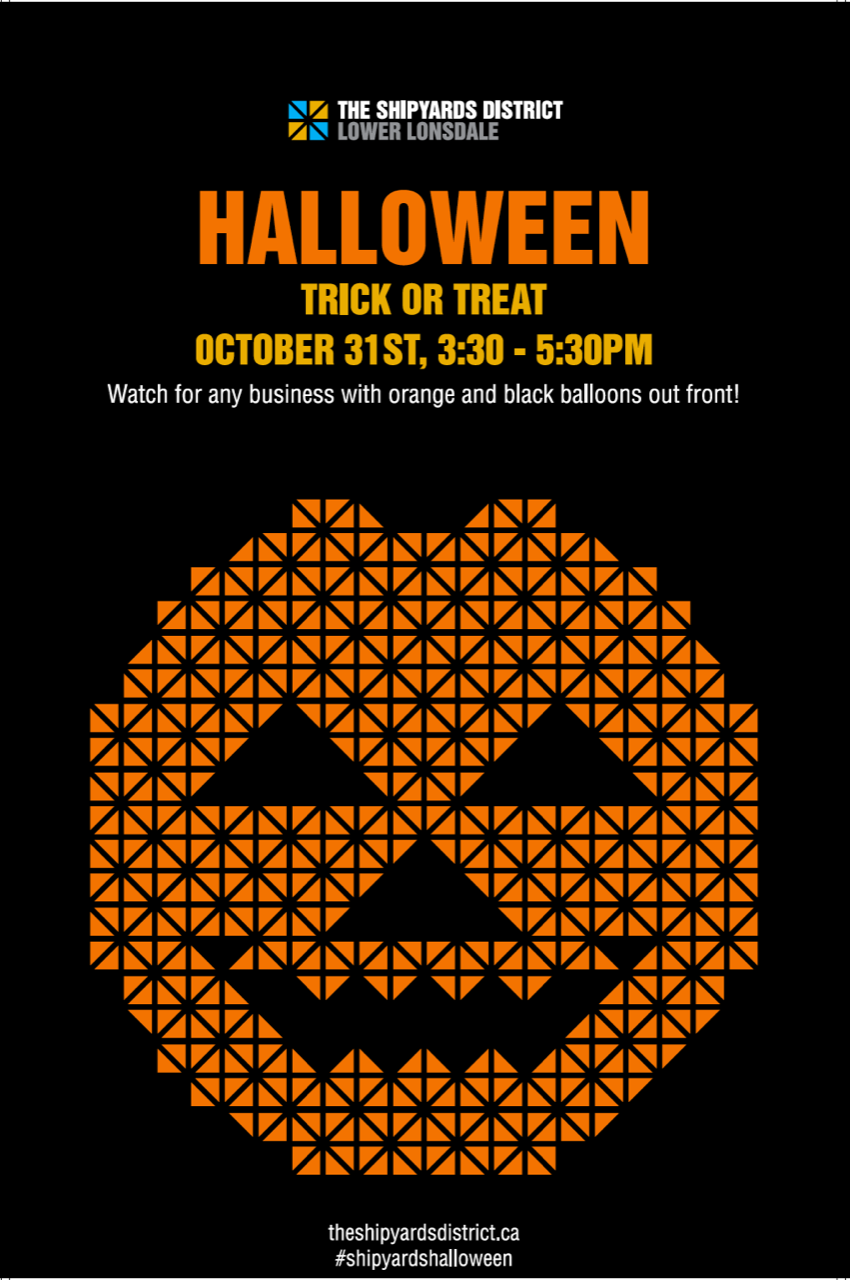 Get ready for a spooktacular time at The Shipyards District this Halloween in partnership with the City of North Vancouver! On October 31st, join us from 3:30 PM to 5:30 PM for a hauntingly fun trick-or-treat experience. Look for black and orange signage to discover over 60 participating businesses handing out sweet treats to all the little ghouls and goblins.