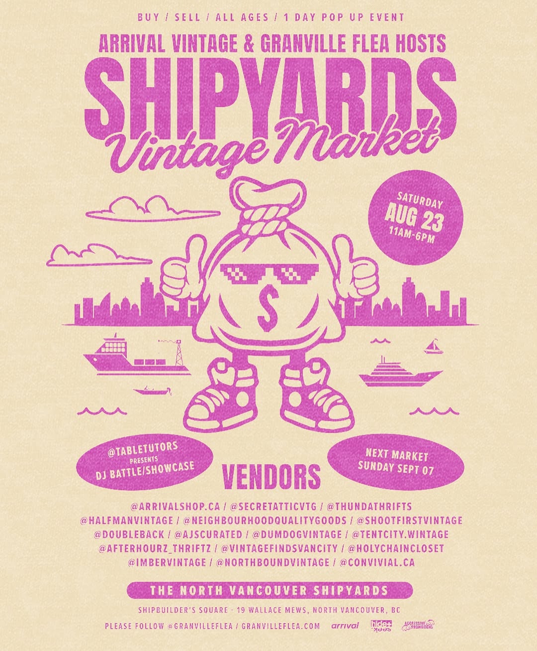 The Granville Flea is back for another summer of vintage markets at Shipbuilders Square! Join us on Saturday, August 23, from 11 AM to 6 PM, featuring some of the best vintage streetwear vendors from across Vancouver.