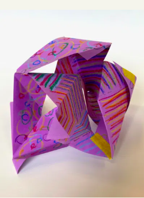 Participants will create patterns on both side of a piece of paper, then will fold an origami boat. Then, the boat will be unfolded and using the folds as guides, 3 cuts along the fold will be made. Then from that point participants will construct a three dimensional form. This activity deconstructs a familiar form – the boat and transforms it through imagination and play.