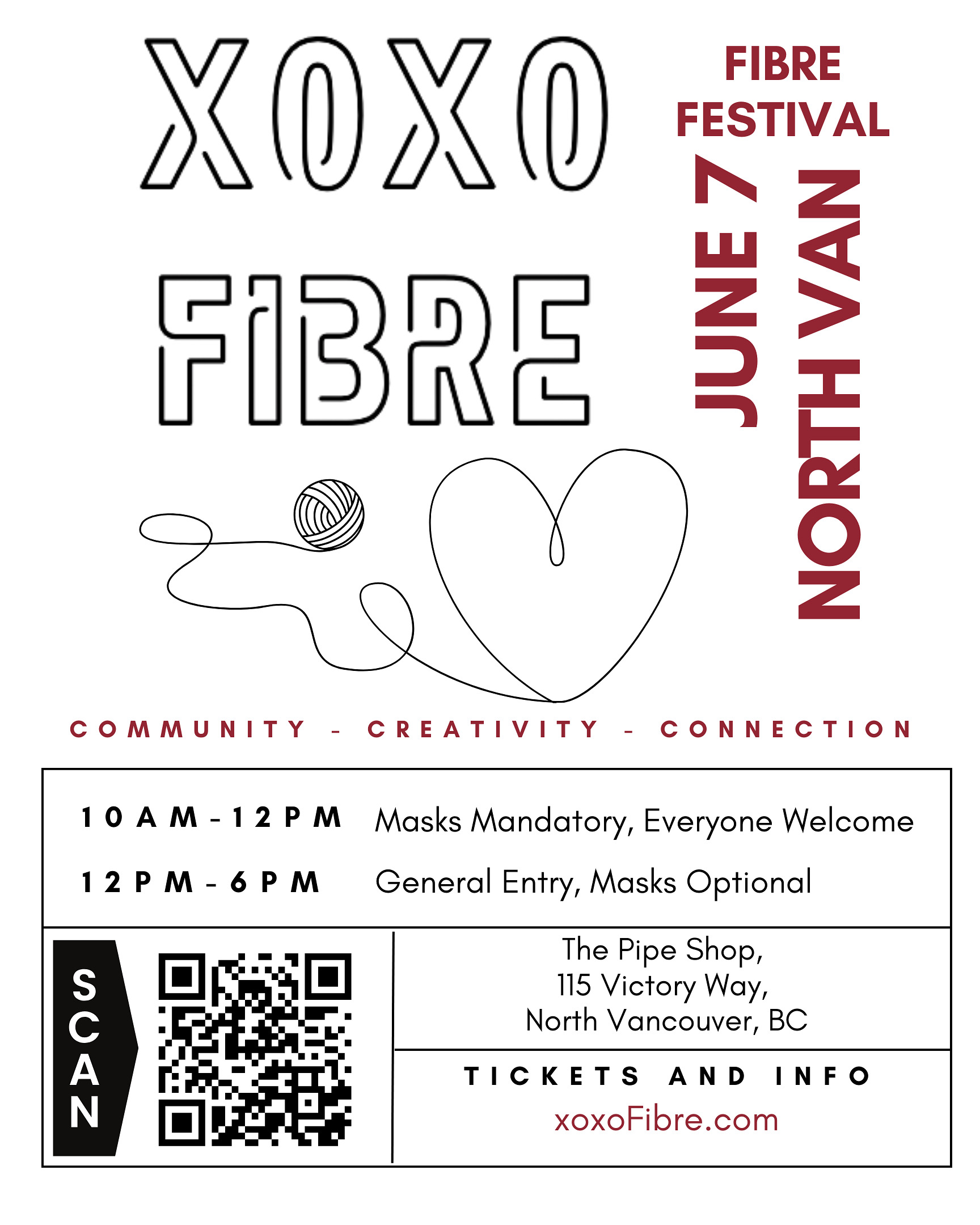 Come for the Yarn. Stay for the People. XOXO Fibre Festival 🧶 A celebration of fibre, creativity & community ✨ Saturday, June 7th | The Pipe Shop, North Vancouver 🎟 Fibre market • Demos • Workshops • Community craft lounge • Door prizes & more! 💖 Inclusive • Accessible • All are welcome