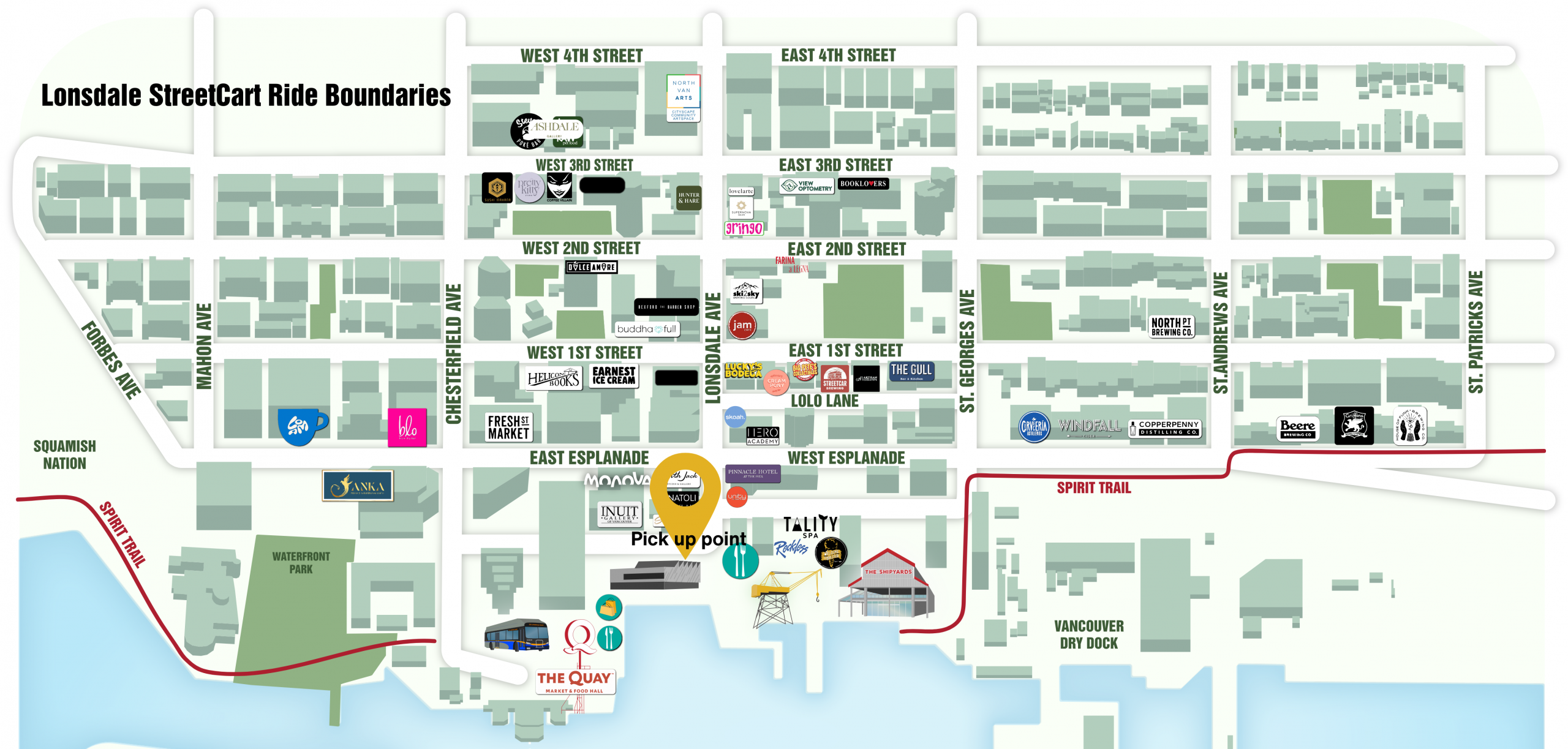 The Lonsdale StreetCart can take you to any business within the Lower Lonsdale neighbourhood boundary or the breweries in The Shipyards Brewery District.
